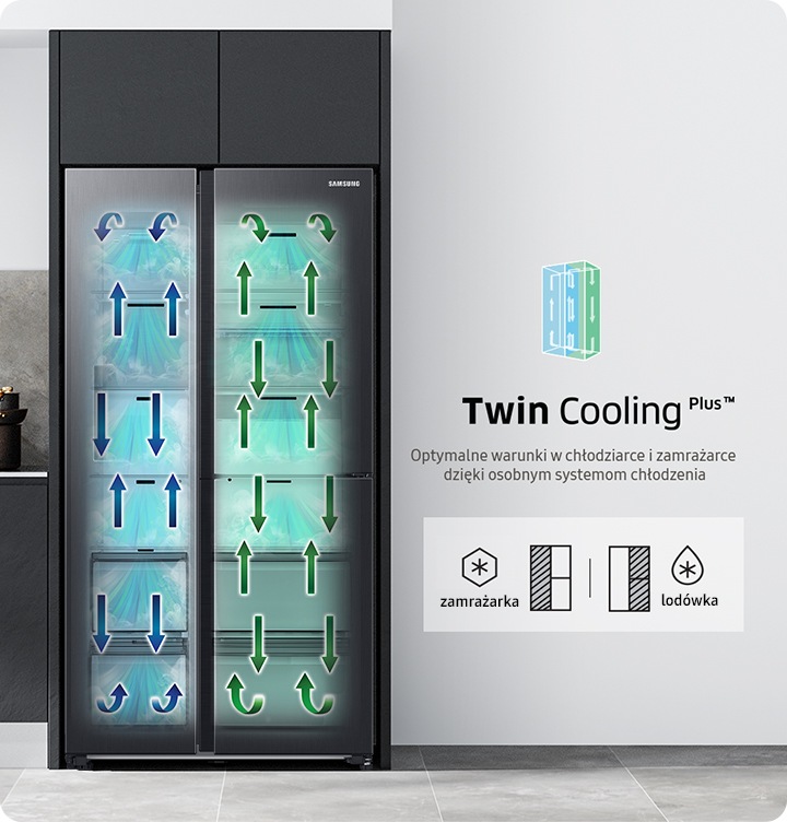 Цей холодильник оснащений технологією Twin Cooling Plus, яка забезпечує ефективне охолодження та збереження овочів і фруктів у свіжості на тривалий час. Він також вирізняється функцією No Frost, що запобігає утворенню льоду й полегшує обслуговування. Функції Power Cool та Power Freeze дозволяють швидко охолоджувати нові продукти, що є особливо корисним у літню спеку.