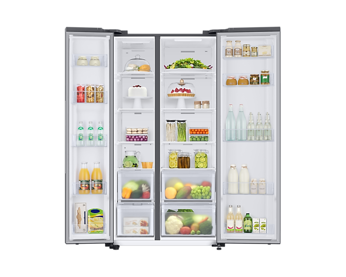 Холодильник Samsung RS66A8101S9/EF — це ідеальне рішення для сучасної кухні, об'єднуючи стиль і функціональність. Завдяки великій брутто-ємності 652 л, він пропонує достатньо простору для зберігання продуктів. Ви зможете користуватися чотирма полицями в холодильній частині та чотирма додатковими полицями у морозильнику, забезпечуючи ефективну організацію.