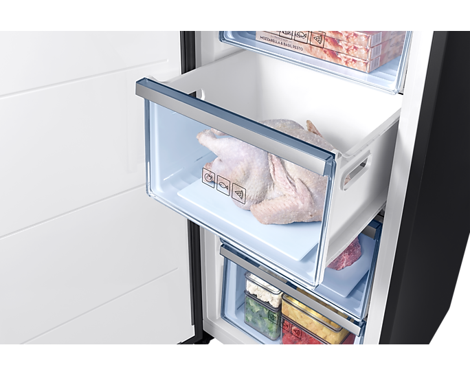 У допоміжній морозильній камері знаходиться 6 поличок, 4 шухляди, а також два контейнери в дверях для зручності зберігання. Холодильник також оснащений функцією Power Freeze, яка дозволяє швидко заморожувати продукти, та сигналом про відкриті двері.