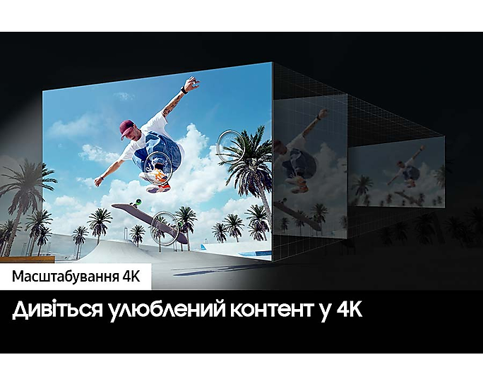 Операційна система Tizen дозволяє легко користуватися смарт-функціями телевізора, такими як Bixby і підтримка Apple AirPlay. Ви зможете відтворювати контент з мобільних пристроїв і використовувати функції, що підвищують зручність перегляду.