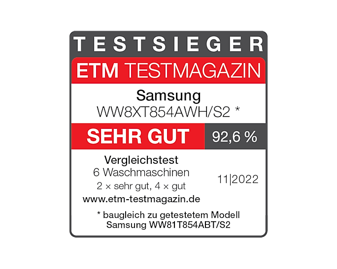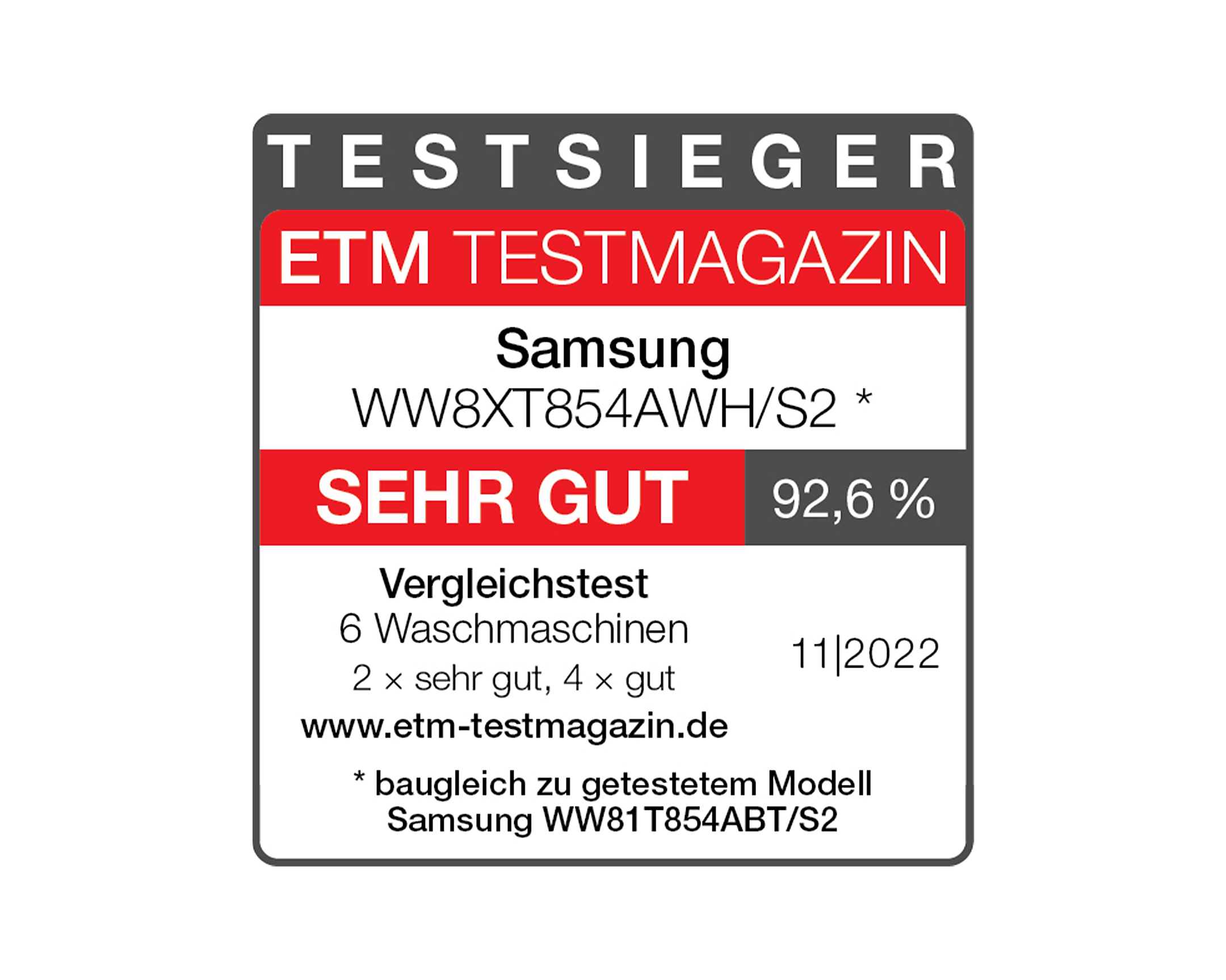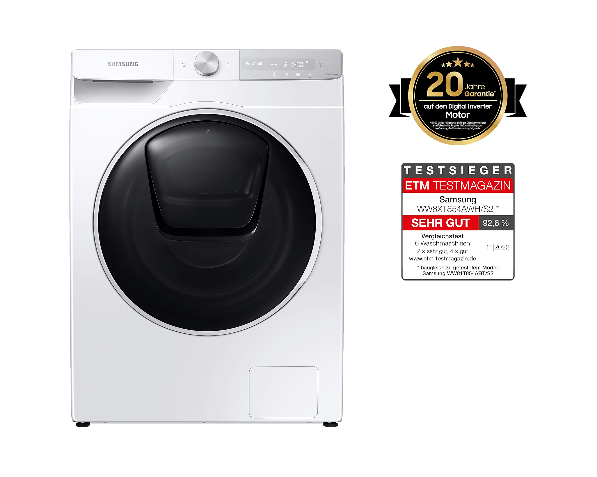 Великолепна функціональність та енергоефективність - ось головні переваги стиральної машини Samsung WW8XT854AWH/S2. Завдяки технології SchaumAktiv машинка надає дуже ретельне та водночас ніжне прання, навіть за низької температури. Це покоління пральних машин оснащене інноваційною технологією QuickDrive™ ECO, що дозволяє досягти повної потужності за половинний час, економлячи при цьому енергію. Технологія Simple Control від Samsung дозволяє програмам автоматично сортуватися відповідно до ваших прань, забезпечуючи максимальний комфорт та ефективність. Ніколи більше не забудете щось додати під час прання - з технологією AddWash™ ви можете легко додати забуті речі навіть під час циклу прання. Із програмою SuperSpeed 39 Min. ви зможете прати 5 кг повсякденного одягу за всього лише 39 хвилин. Машина також пропонує гігієнічне дезінфікування за допомогою пару, що видаляє 99,9% бактерій та алергенів. Машина також оснащена функцією FleckenIntensiv, яка дозволяє легко видалити плями навіть з найсильнішими забрудненнями. Для більшої зручності машина має також самоочищуючийся відділ для прального засобу і надійний цифровий інверторний двигун з гарантією 20 років, що забезпечує ефективну роботу та тривалу службу. Не потрібно використовувати хімікати для чищення барабану - функція Trommelreinigung+ забезпечить безпеку та протидію неприємним запахам. Усі ці параметри роблять Samsung WW8XT854AWH/S2 ідеальним вибором для сімей, які цінують комфорт, якість та ефективність.
