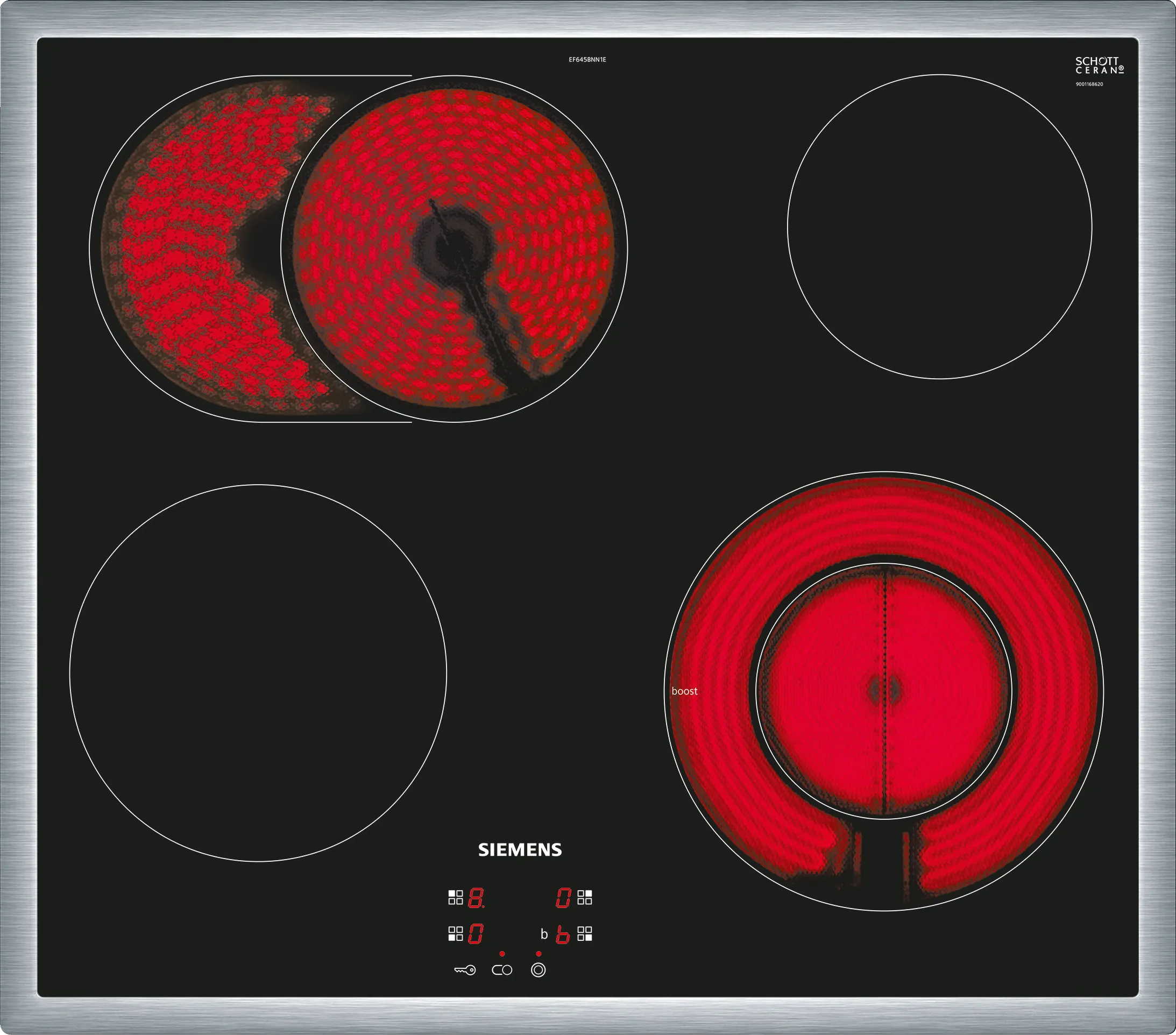 Варильна поверхня Siemens EF645BNN1E поєднує в собі стильний дизайн та потужність для ваших кулінарних потреб. Ця електрична варильна поверхня оснащена чотирма зонами нагріву, включаючи двоконтурну зону і зону для запікання, що дозволяє готувати різноманітні страви одночасно.