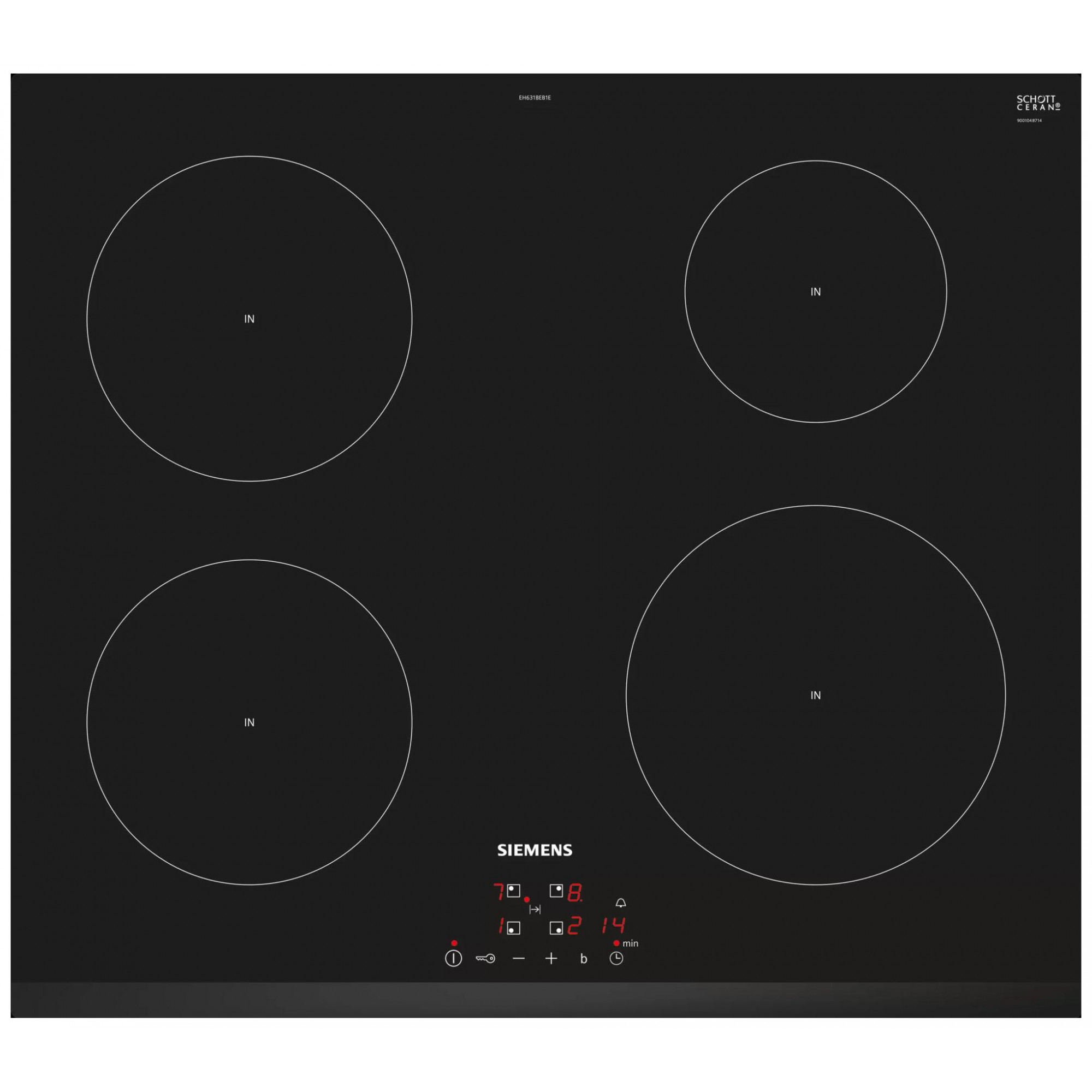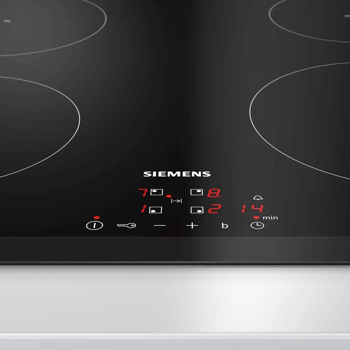 Індукційна варильна поверхня **Siemens EH631BEB1E** — це сучасний прилад, що поєднує стильний дизайн і передові технології. Завдяки своєму **склокерамічному покриттю** вона не лише виглядає естетично, але й забезпечує легкість у догляді. Прилад обладнаний **четирма електричними конфорками** з **індукційними нагрівальними елементами**, що забезпечує швидке та ефективне приготування їжі, зменшуючи час приготування до мінімуму.
