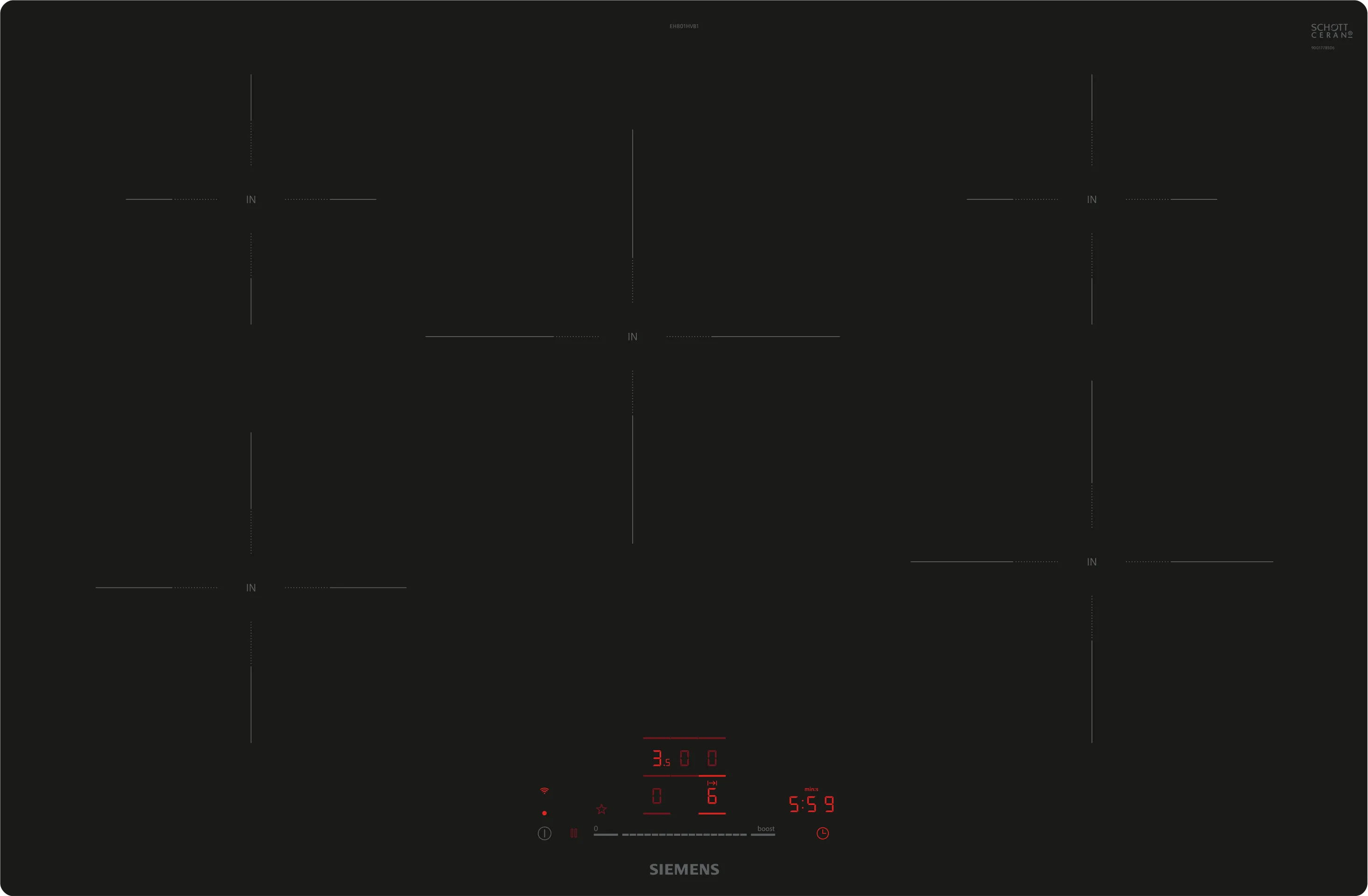 Варочна поверхня Siemens EH801HVB1E поєднує в собі сучасний дизайн і передові технології, що робить процес приготування їжі максимально комфортним. Ця індукційна варочна поверхня має п'ять зон нагріву, що забезпечує можливість одночасної обробки кількох страв. Кожна зона округлої форми і пристосована для використання стандартного кухонного посуду.