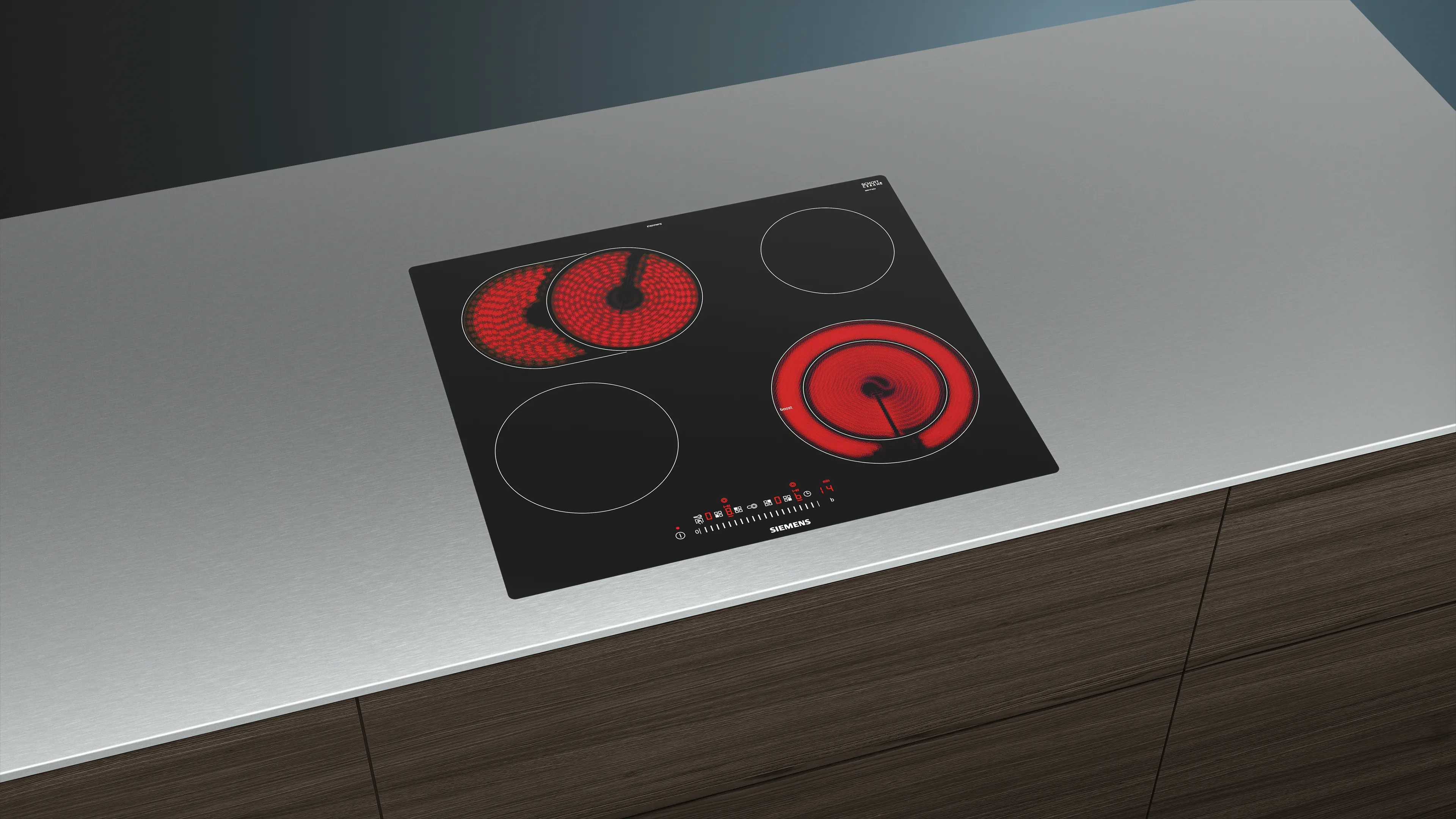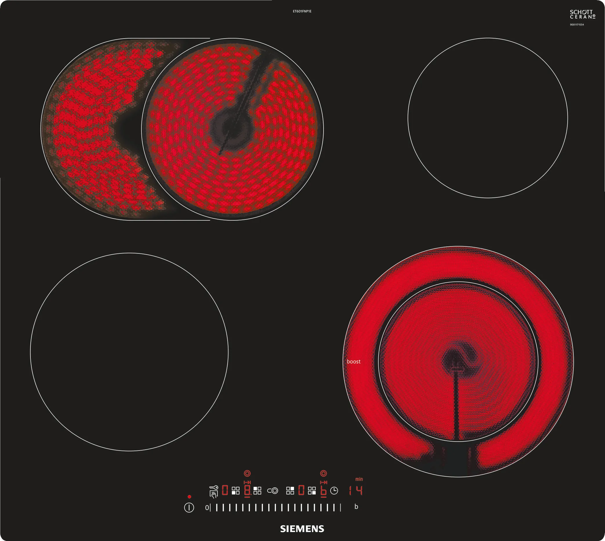 Siemens ET601FNP1E – це сучасна електрична варочна поверхня, яка призначена для комфортного приготування їжі. Вона обладнана чотирма варочними зонами, що дозволяє готувати кілька страв одночасно. Зональне конфігурування включає двоциркову зону та зону для обсмажування, що забезпечує максимальну гнучкість у використанні.