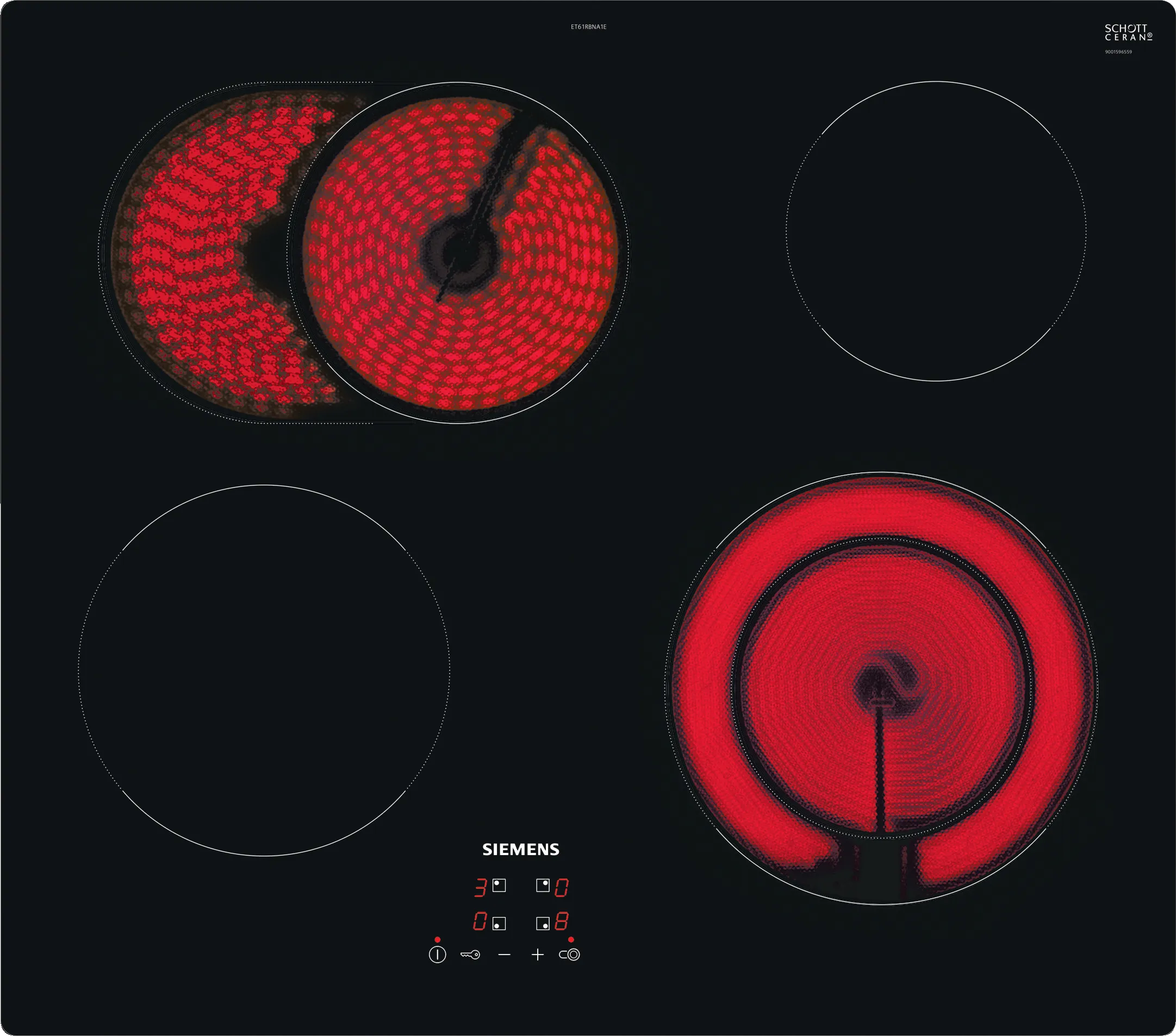 Варочная поверхность Siemens ET61RBNA1E - это идеальный выбор для тех, кто ценит качество и инновации в кухне. Данная модель представляет собой электрическую варочную поверхность с четырьмя зонами нагрева, включая двухконтурную и жарочную зону, что предоставляет вам возможность готовить различные блюда одновременно.