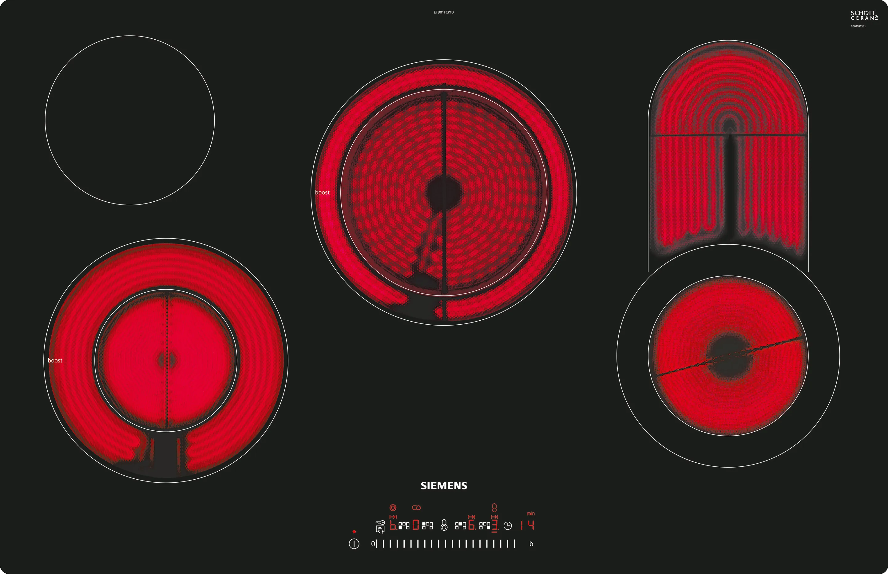 Варочна поверхня Siemens ET801FCP1D - це ідеальний вибір для сучасної кухні з передовими технологіями та зручним управлінням. Ця електрична варочна поверхня має 4 основні зони нагріву, які дозволяють готувати кілька страв одночасно, що значно підвищує ефективність приготування їжі.