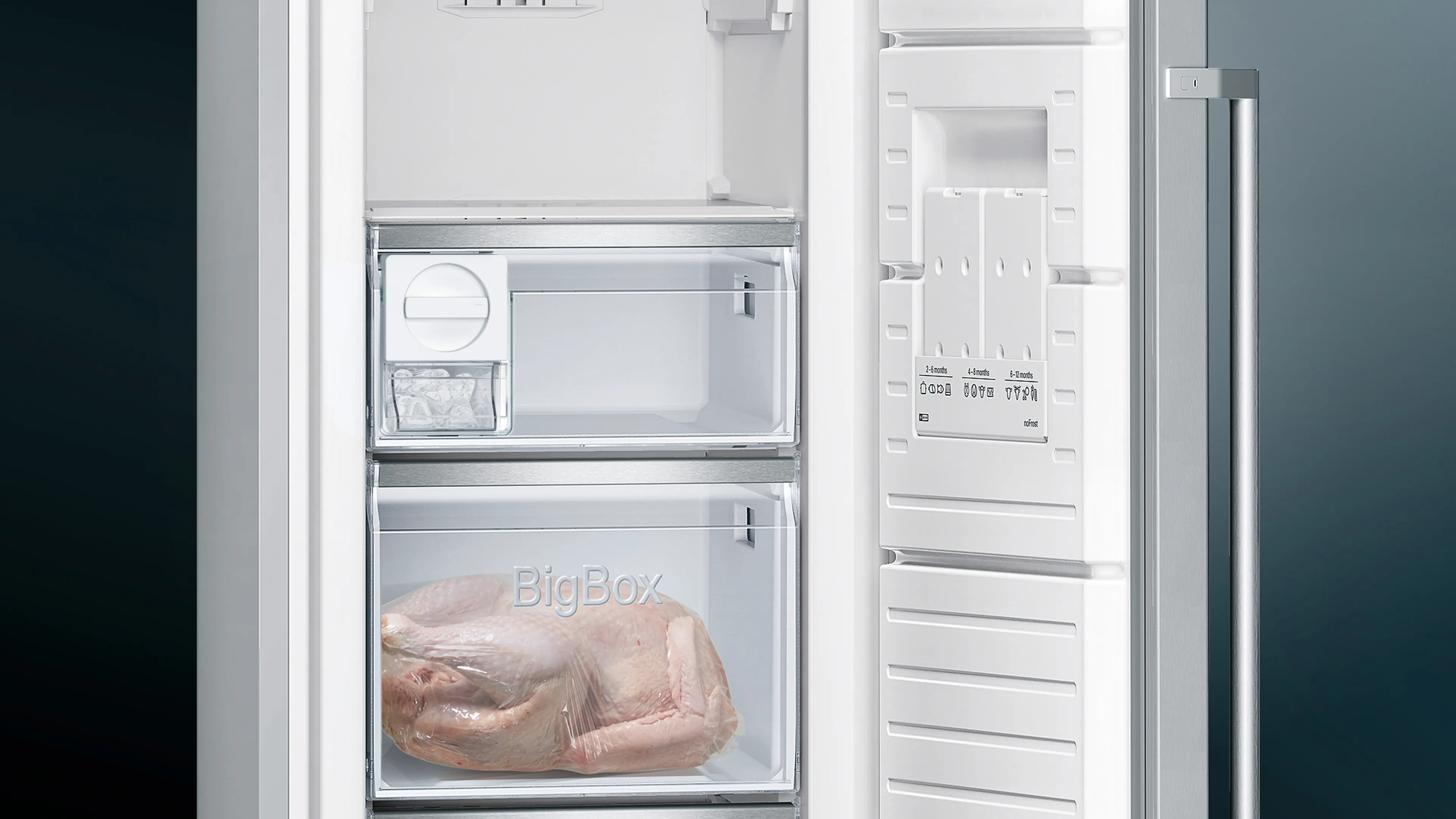 Крім того, холодильник оснащений технологією bigBox, що дозволяє зручно зберігати великі запаси продуктів. З рівнем шуму всього 39 дБ(A), ця модель працює тихо, не порушуючи вашого спокою. Ідеальна для відкритих кухонних просторів!