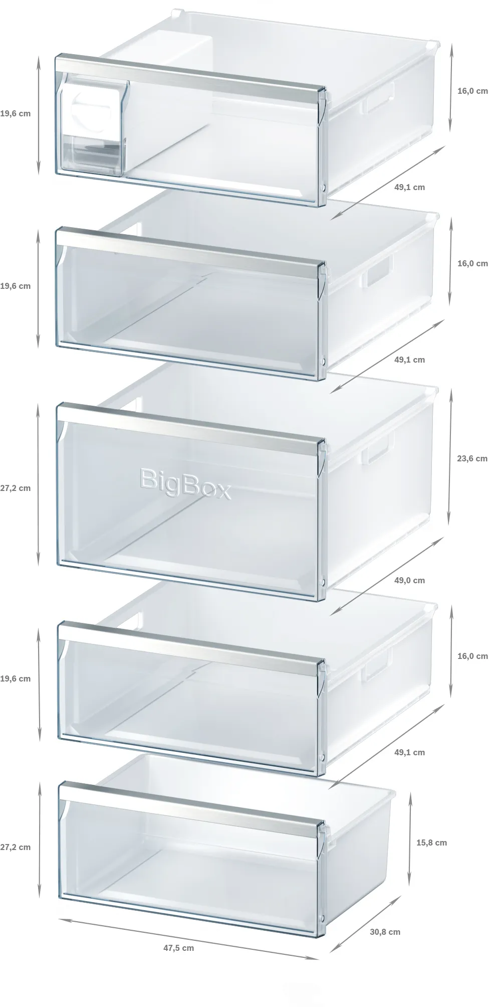 Завдяки функції FrostbigBox, ви матимете більше місця для зберігання великих заморожених продуктів, що особливо зручно для сімейних покупок або сезонних запасів. Запатентована технологія Home Connect забезпечує інтеграцію з вашим смартфоном, що дозволяє вам контролювати прилад на відстані та отримувати оновлення безпеки.