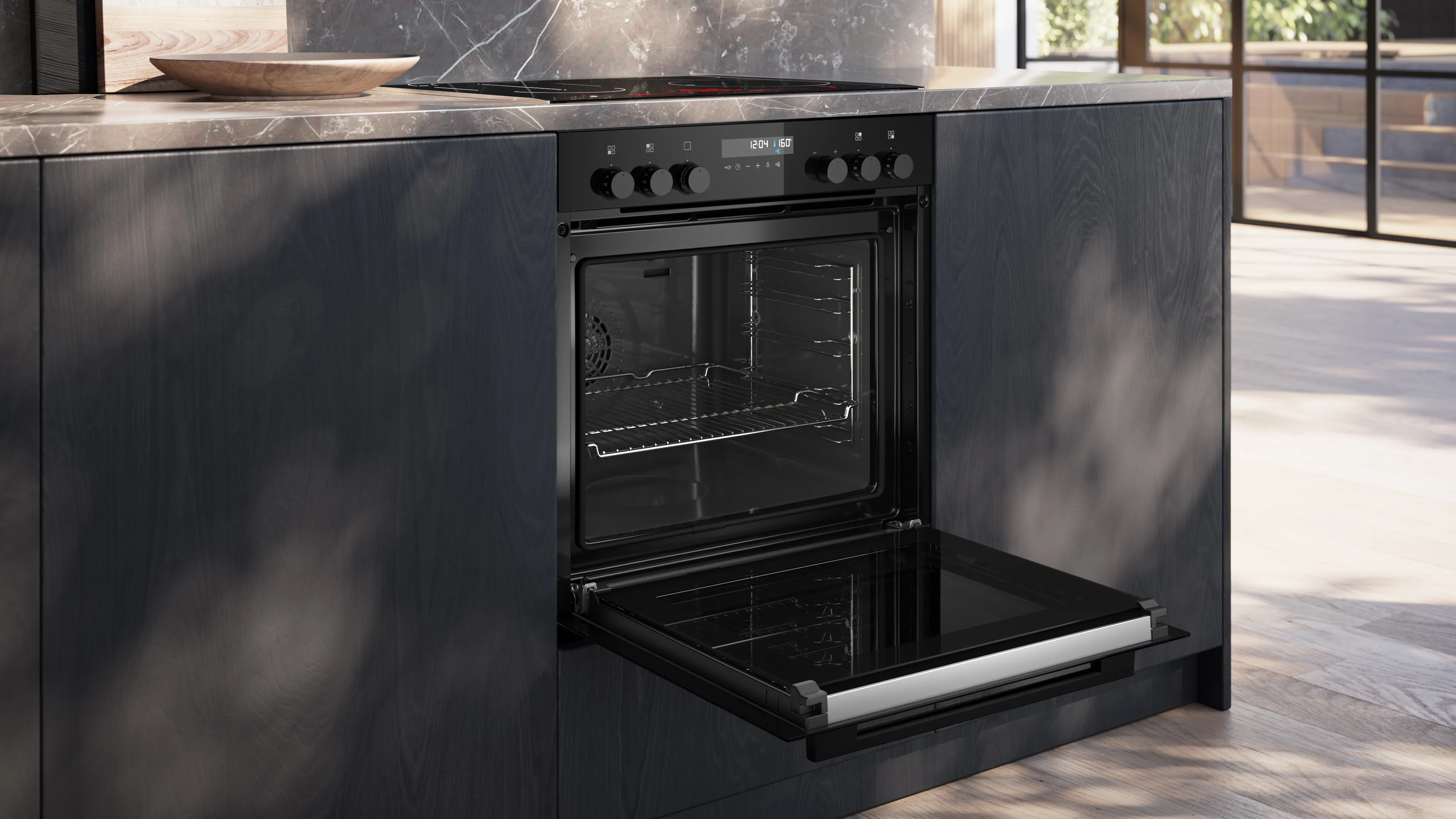 Піч обладнана білим LCD-дисплеєм з зручним механічним управлінням, що дозволяє легко обирати потрібний режим приготування. Однією з ключових переваг моделі є інтегроване очищення за рахунок піролізних і гідролізних технологій, що спрощує процес догляду за пристроєм та забезпечує його довговічність.