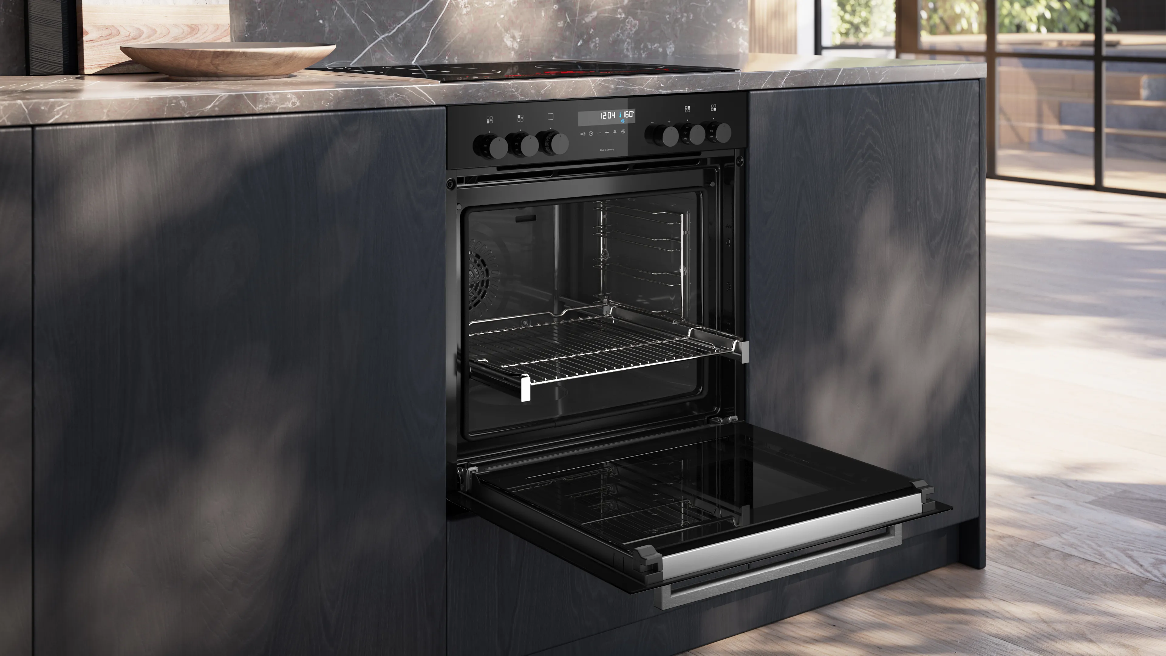 Модель оснащена білосніжним LCD-дисплеєм з зручним поворотним регулятором, який забезпечує простоту у налаштуваннях. Вбудоване систему очищення представляють піролітичні і гідролітичні технології, що дозволяють з легкістю підтримувати чистоту пристрою без зайвих зусиль.