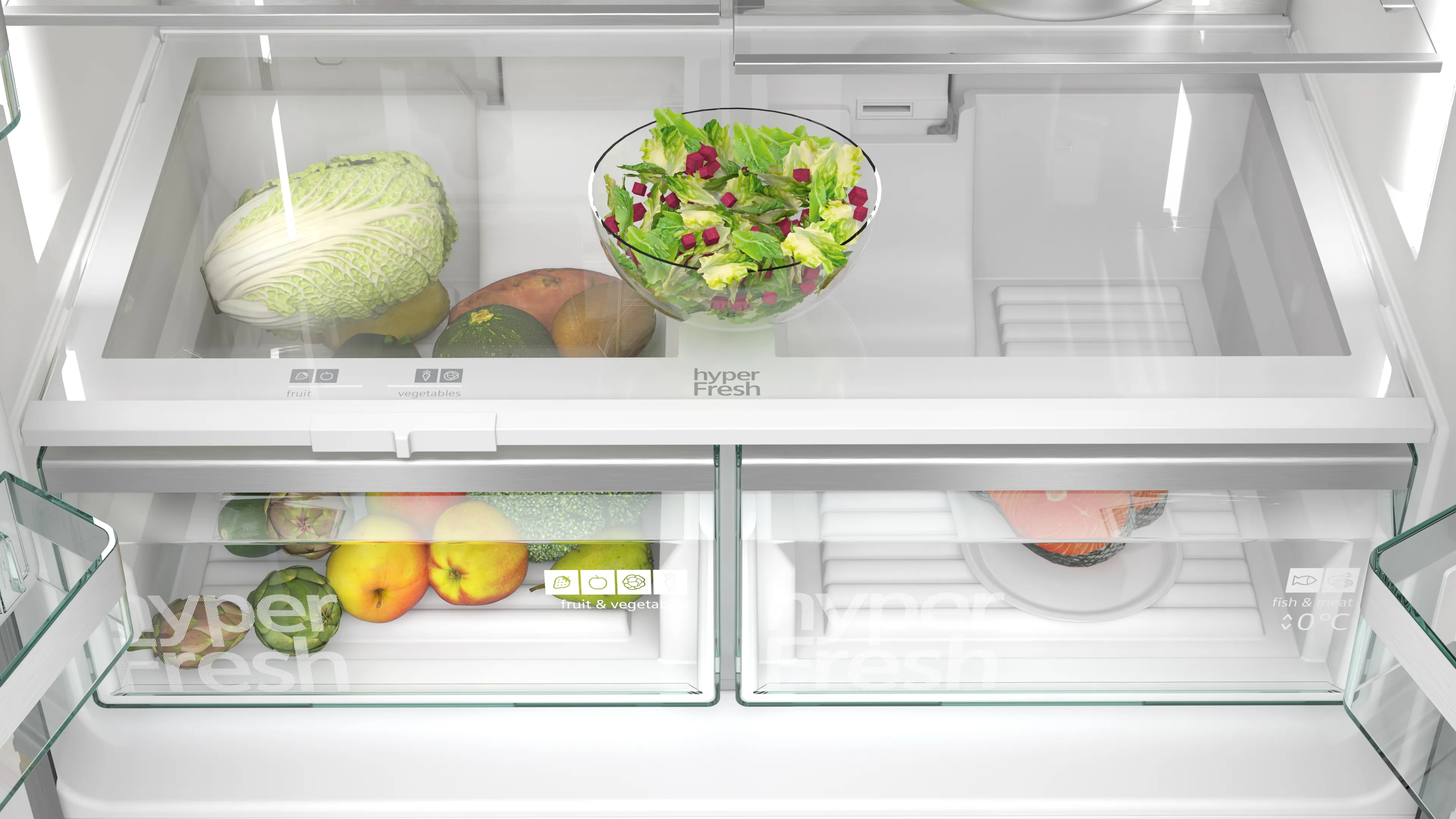 Завдяки технології Total NoFrost, ваші продукти завжди залишатимуться свіжими, а вам більше не доведеться турбуватися про обмерзання. Холодильник також обладнаний системою hyperFresh plus для оптимального зберігання фруктів та овочів, а також функцією hyperFresh bigBox, що дозволяє зручно зберігати великі тари та продукти.