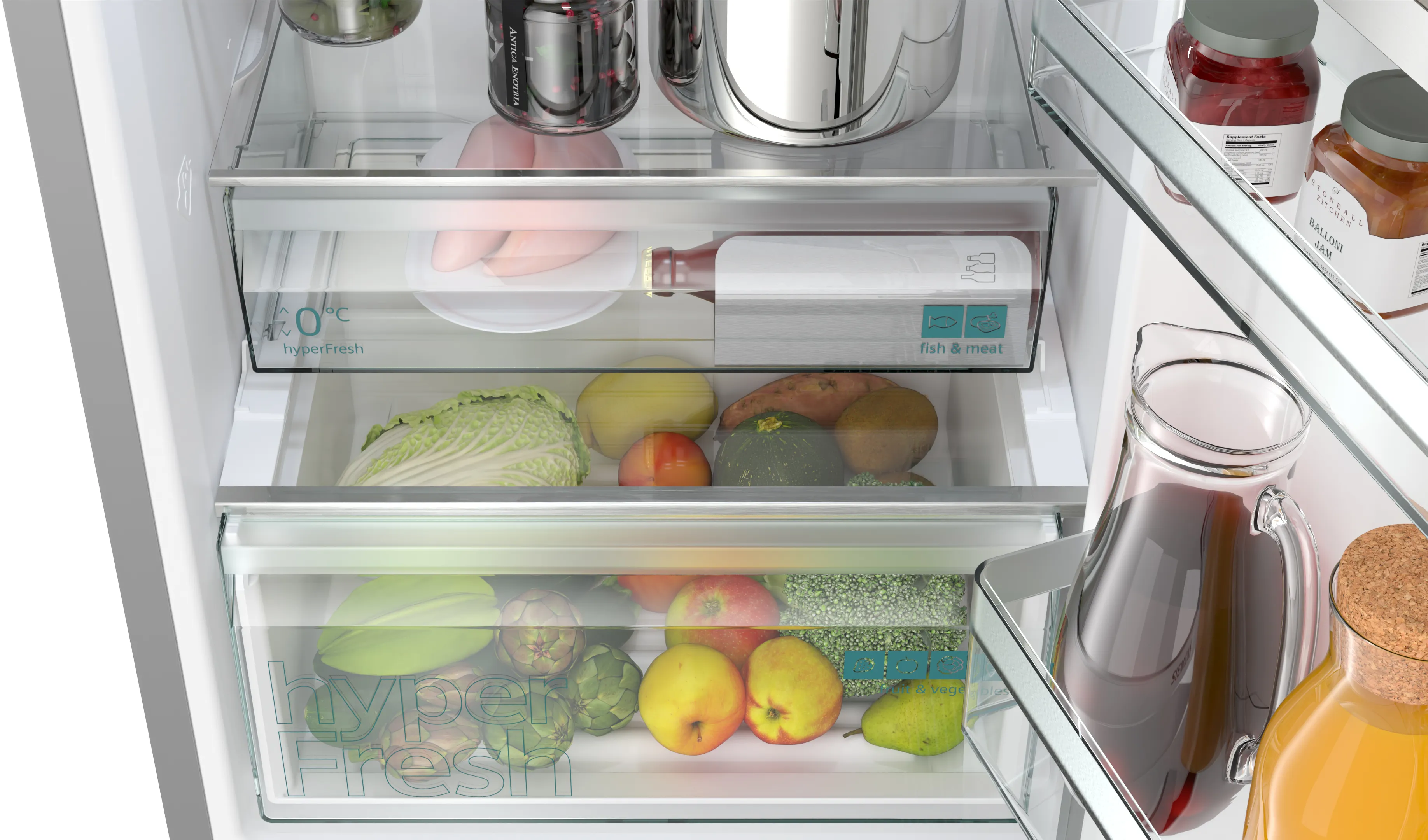 Холодильник укомплектований інноваційною системою зберігання овочів та фруктів hyperFresh Plus, яка підтримує оптимальні умови для зберігання їжі, щоб зберегти свіжість на тривалий строк. Завдяки вмісткому ящику hyperFresh bigBox, ви отримуєте додатковий простір для зберігання більших продуктів.