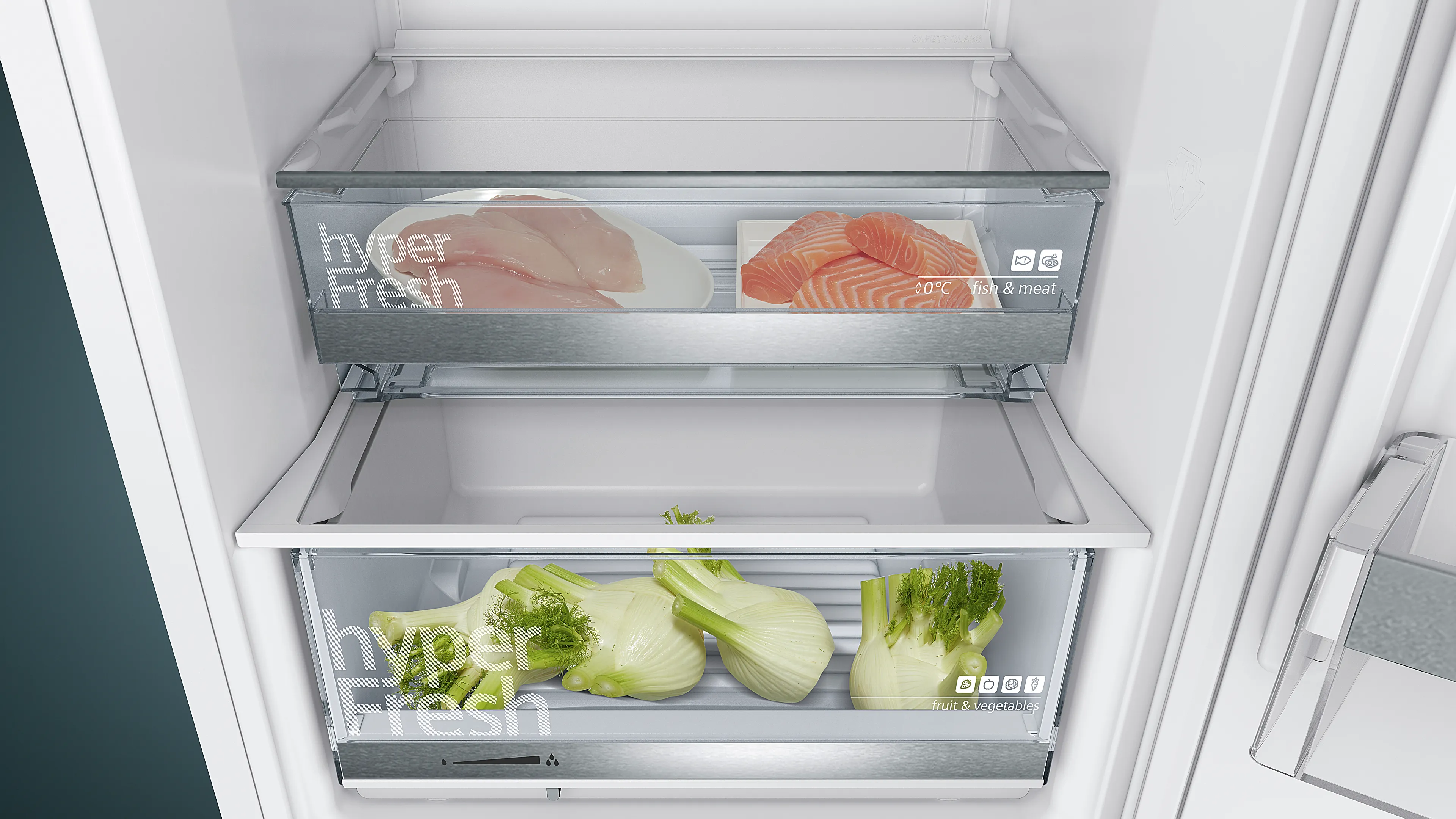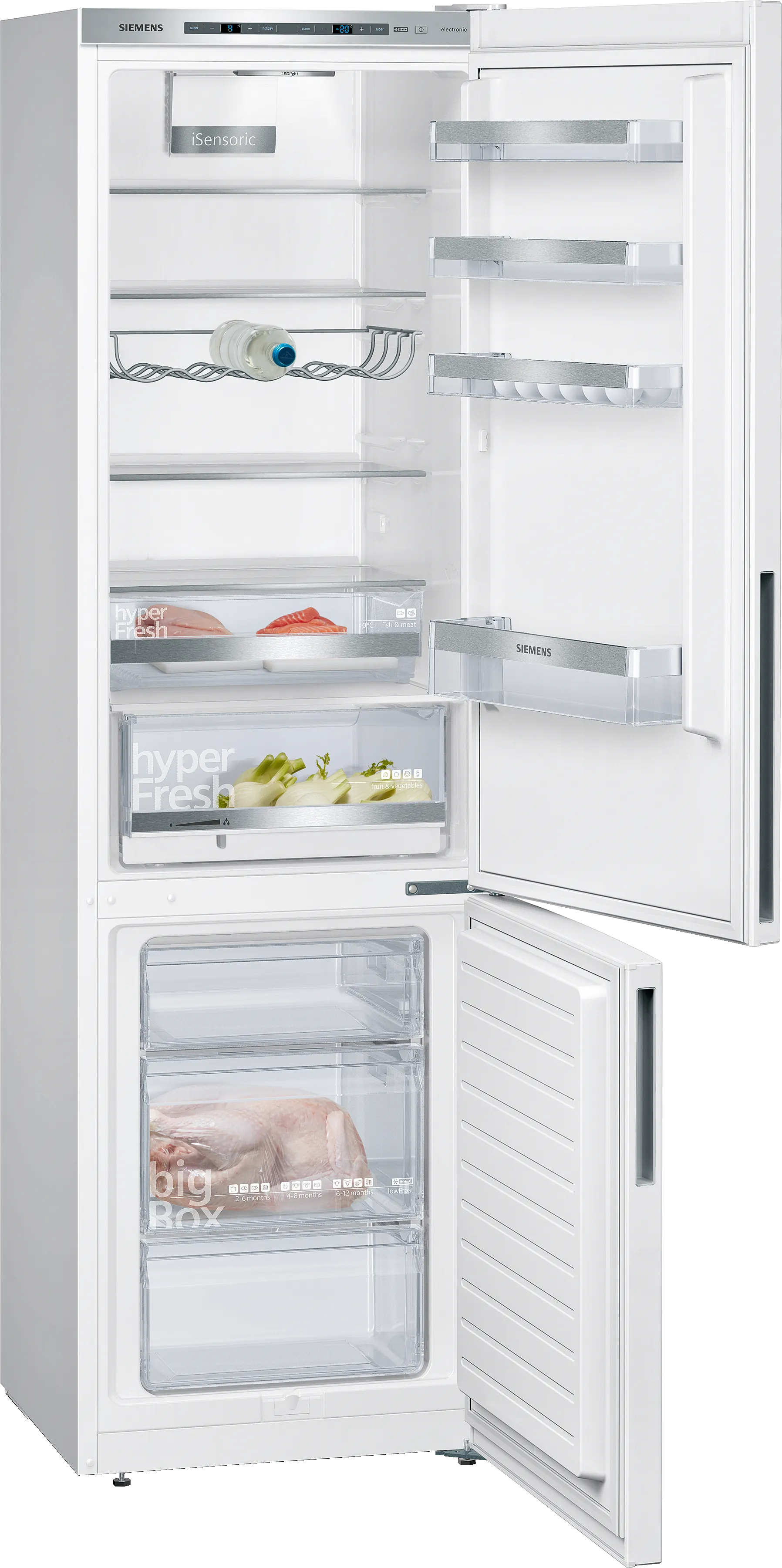 Модель виконана в стильному білому кольорі та обладнана системою hyperFresh Plus, що забезпечує тривале збереження свіжості продуктів, зокрема овочів та фруктів. Додаткова hyperFresh bigBox дозволяє зручно зберігати великогабаритні продукти, такі як піца або торт, не займаючи зайвого місця.