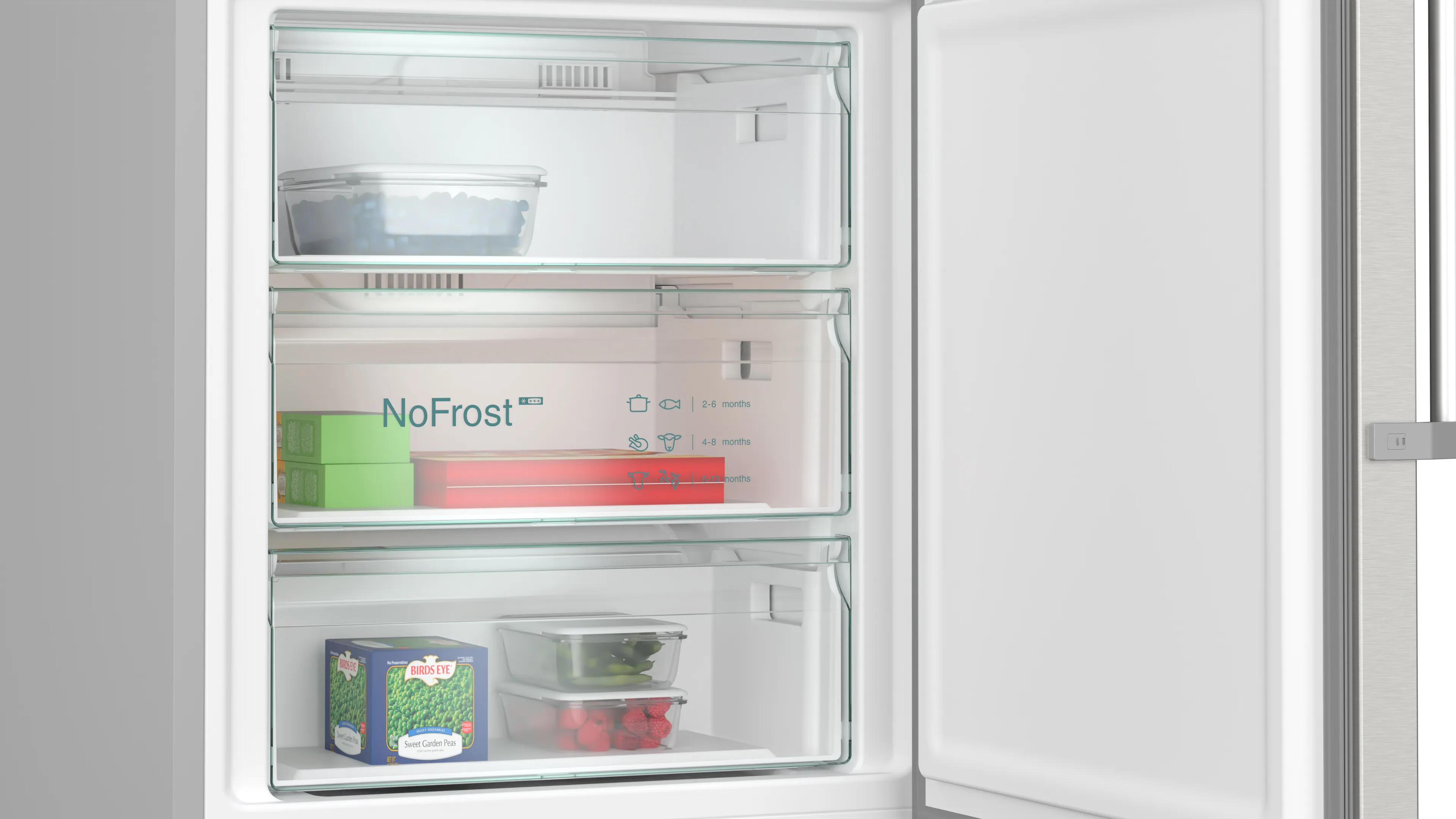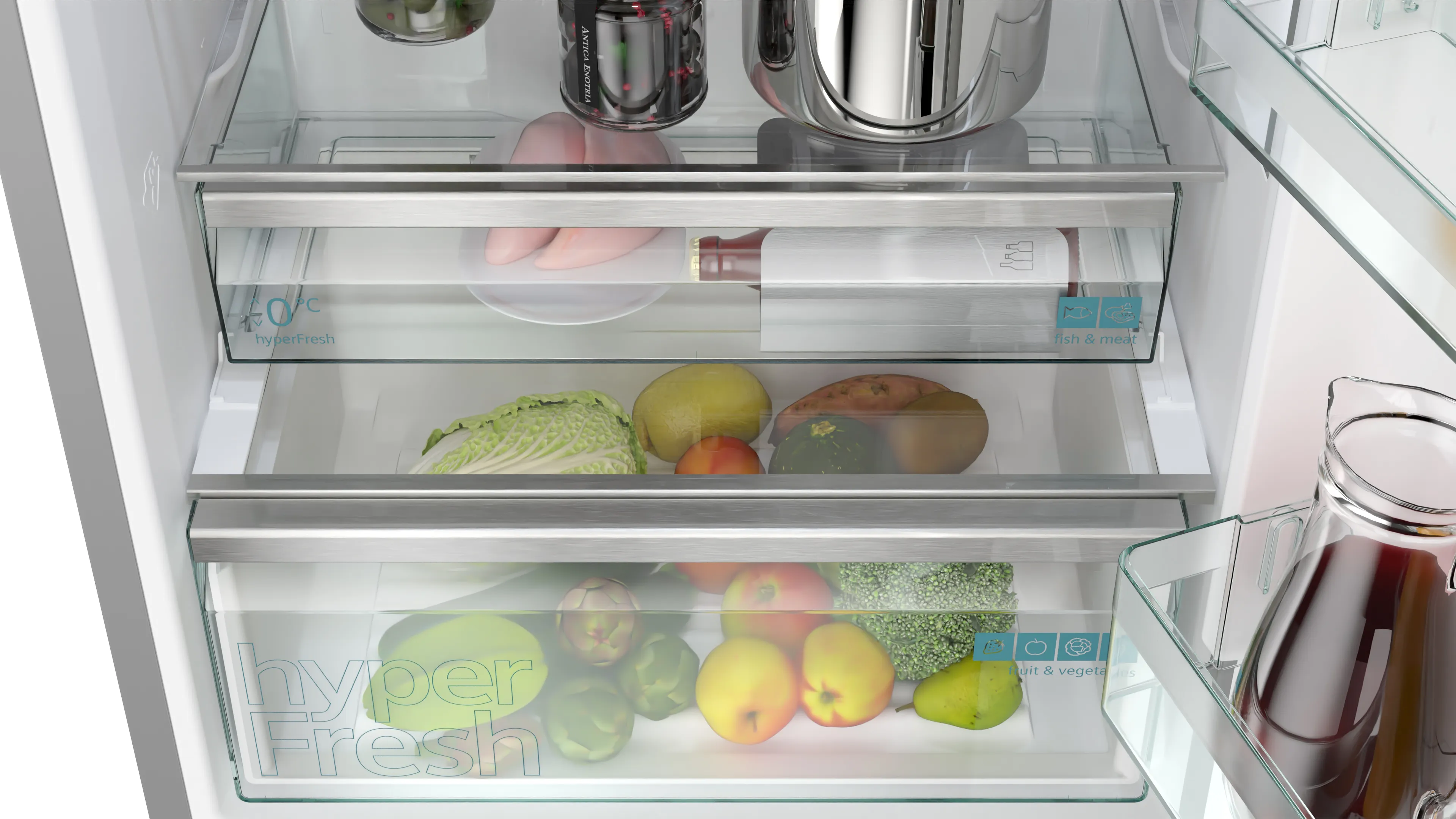 Холодильник також оснащено системою hyperFresh plus, що дозволяє зберігати продукти свіжими довше, завдяки оптимальній контролю вологи та температури. Простір для великих продуктів забезпечує функція hyperFresh bigBox, що особливо зручно для зберігання овочів та фруктів.