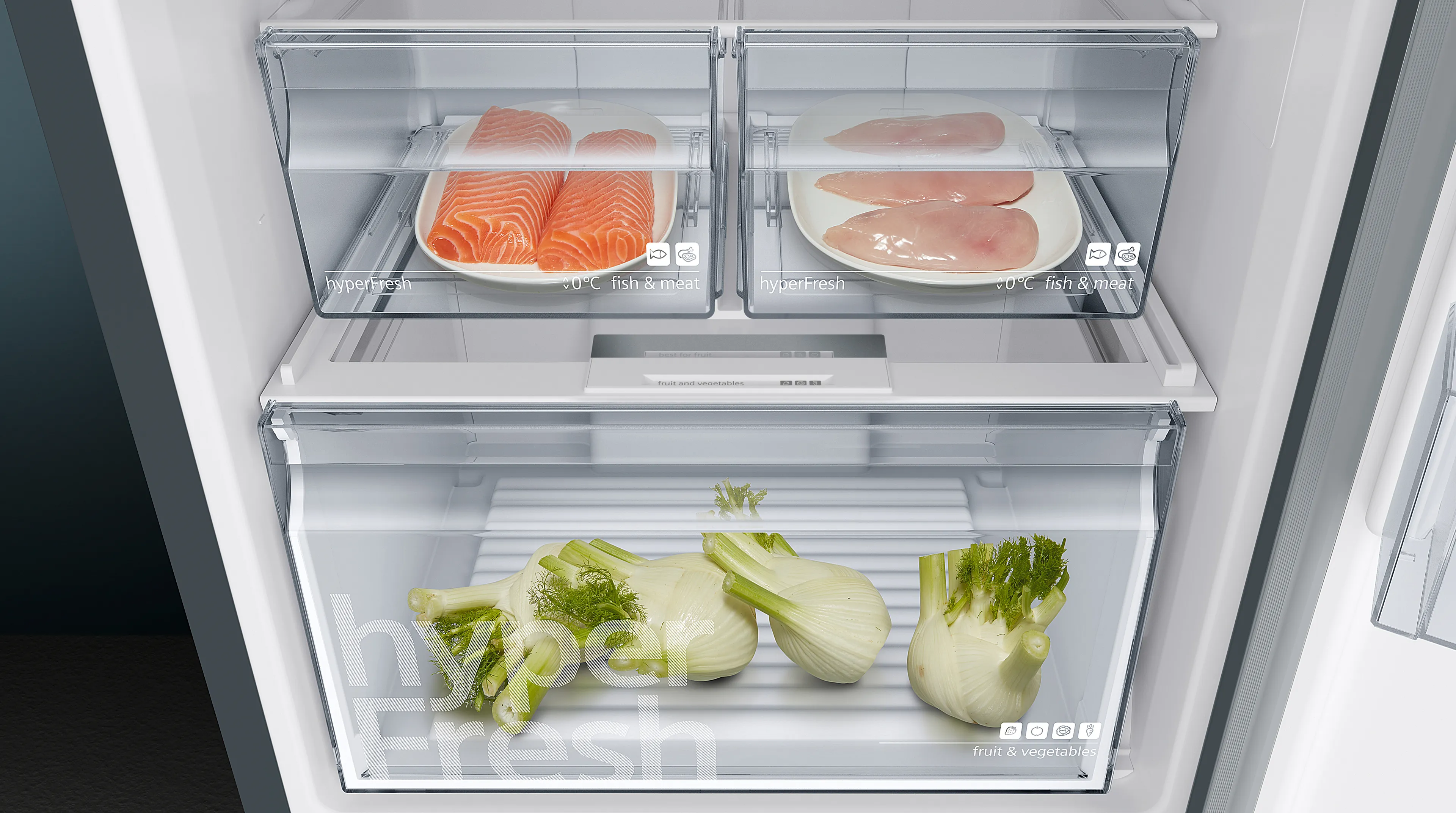 Однією з ключових переваг цього холодильника є технологія Total NoFrost, що виключає необхідність розморожування. Ви можете насолоджуватись ідеальними умовами зберігання продуктів без зайвих турбот. Холодильник забезпечує оптимальну вологість і свіжість завдяки системі hyperFresh, що дозволяє зберігати вітаміни і смакові якості ваших продуктів.