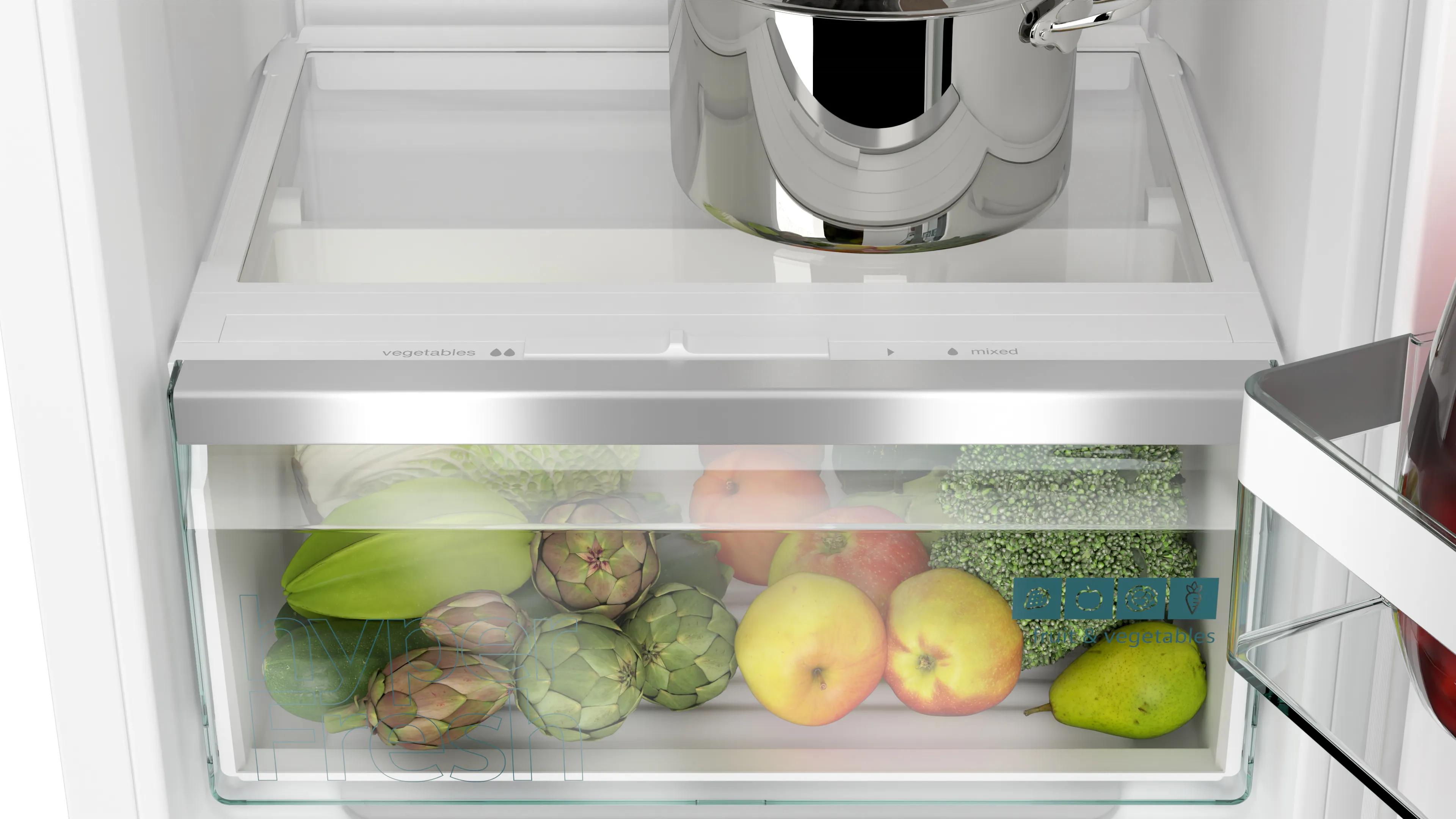 Тиха робота при 28 дБ дозволяє розмістити пристрій у будь-якому приміщенні, не створюючи зайвого шуму. Конструкція холодильника включає в себе сучасну технологію freshSystem hyperFresh, яка забезпечує свіжість продуктів на довгий час.