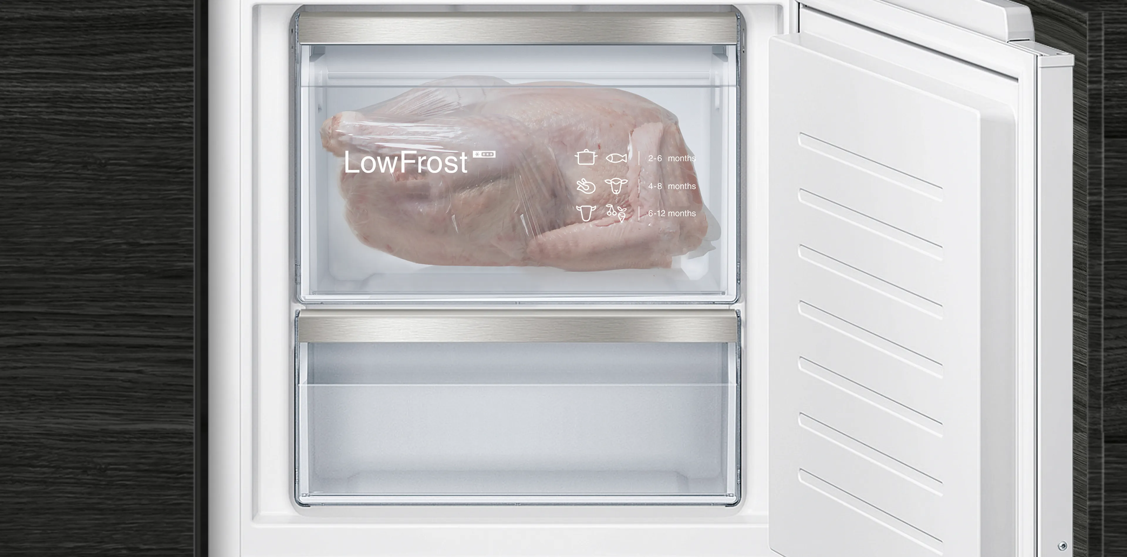 З рівнем шуму всього 38 дБ, цей холодильник працює тихо, що робить його ідеальним для відкритих планувань або невеликих квартир. Модель обладнана hyperFreshbigBox, що дозволяє економити місце для великих продуктів, таких як тістечка або м'ясо. Ваші улюблені страви завжди будуть у свіжому стані.