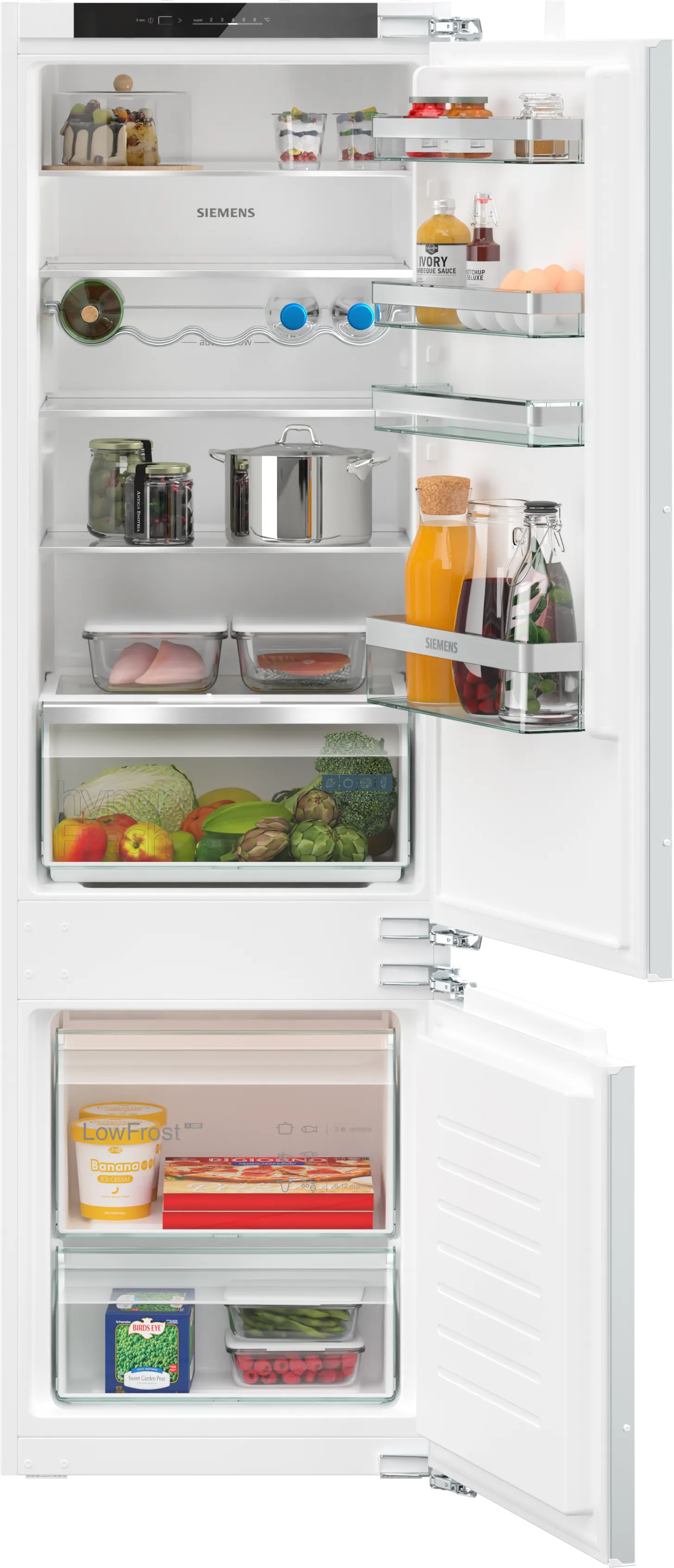 Ваша їжа буде зберігатися свіжою завдяки системі hyperFresh bigBox, яка дозволяє з легкістю зберігати великі продукти. Холодильник також працює надзвичайно тихо — з рівнем шуму всього 35 дБ(A), забезпечуючи комфорт і спокій у вашій оселі.