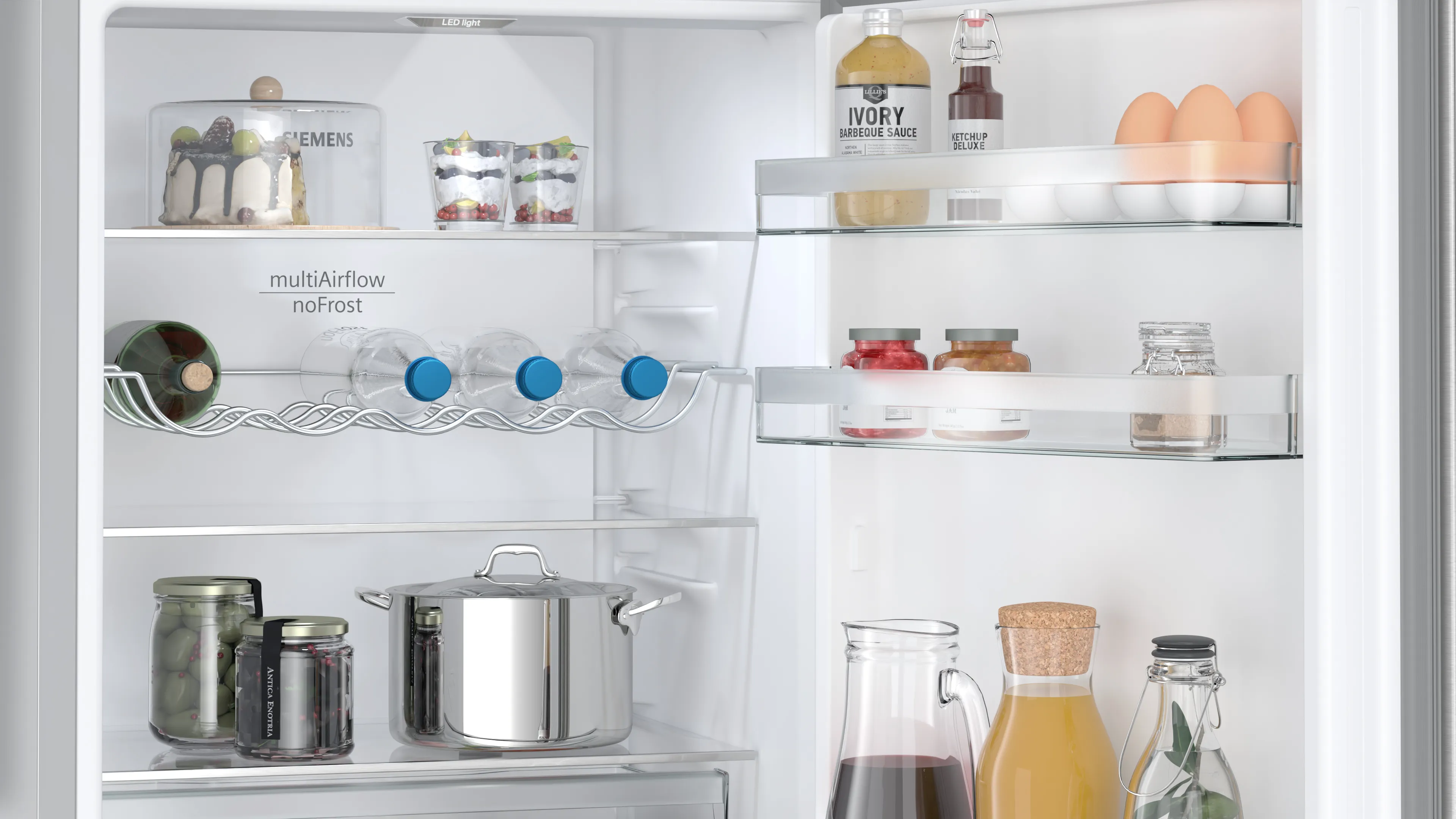 Siemens MK67KGNIBA обладнано технологією **Total NoFrost**, що означає автоматичне розморожування і відсутність льоду – вам більше не потрібно буде турбуватися про накопичення криги у морозильнику. З рівнем шуму всього **33 дБ**, цей холодильник працює надзвичайно тихо, що робить його ідеальним вибором для будь-якої кухні.