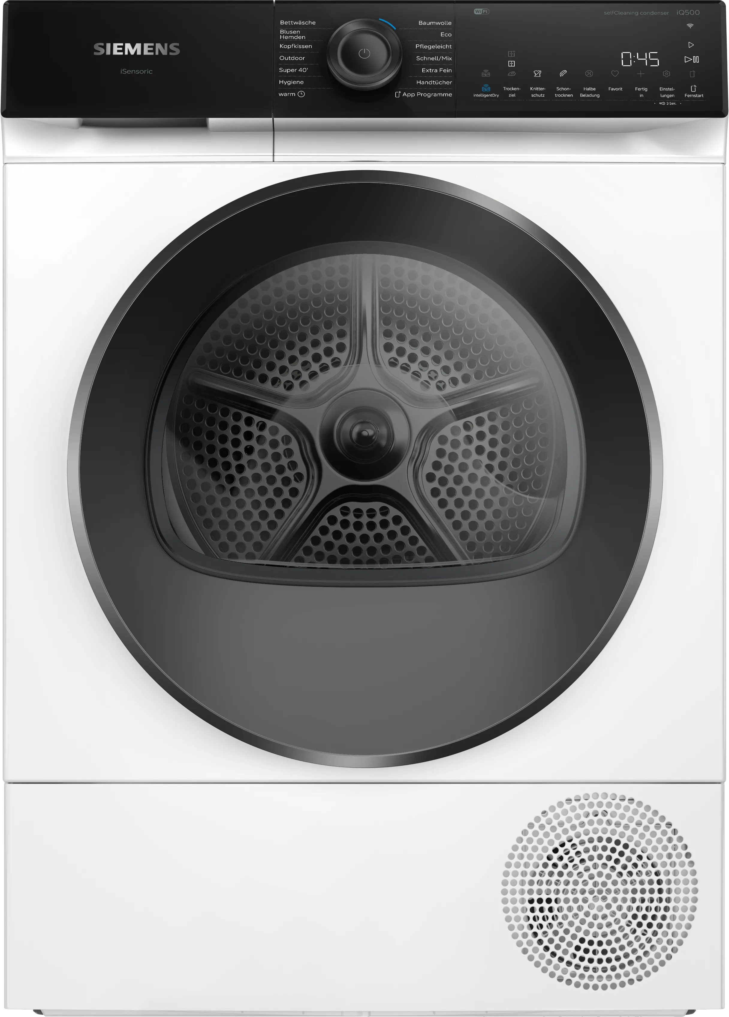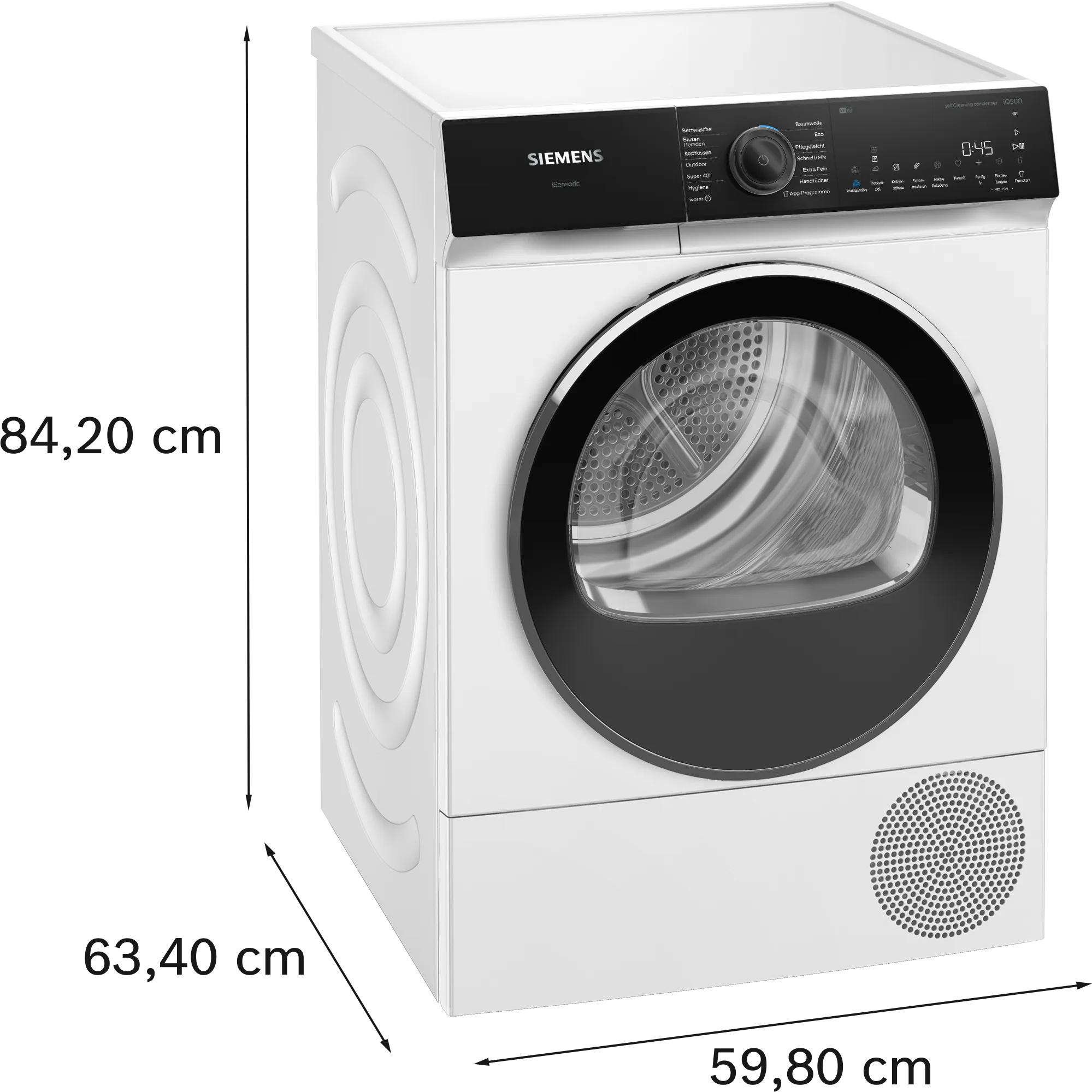 Сушильна машина оснащена самоочисним конденсатором, що полегшує її обслуговування і підтримує високу ефективність роботи. З рівнем шуму всього 63 дБ(A), ви можете насолоджуватися тишею під час її використання. Для тих, хто цінує швидкість, функція швидкої програми на 40 хвилин стане справжнім порятунком.