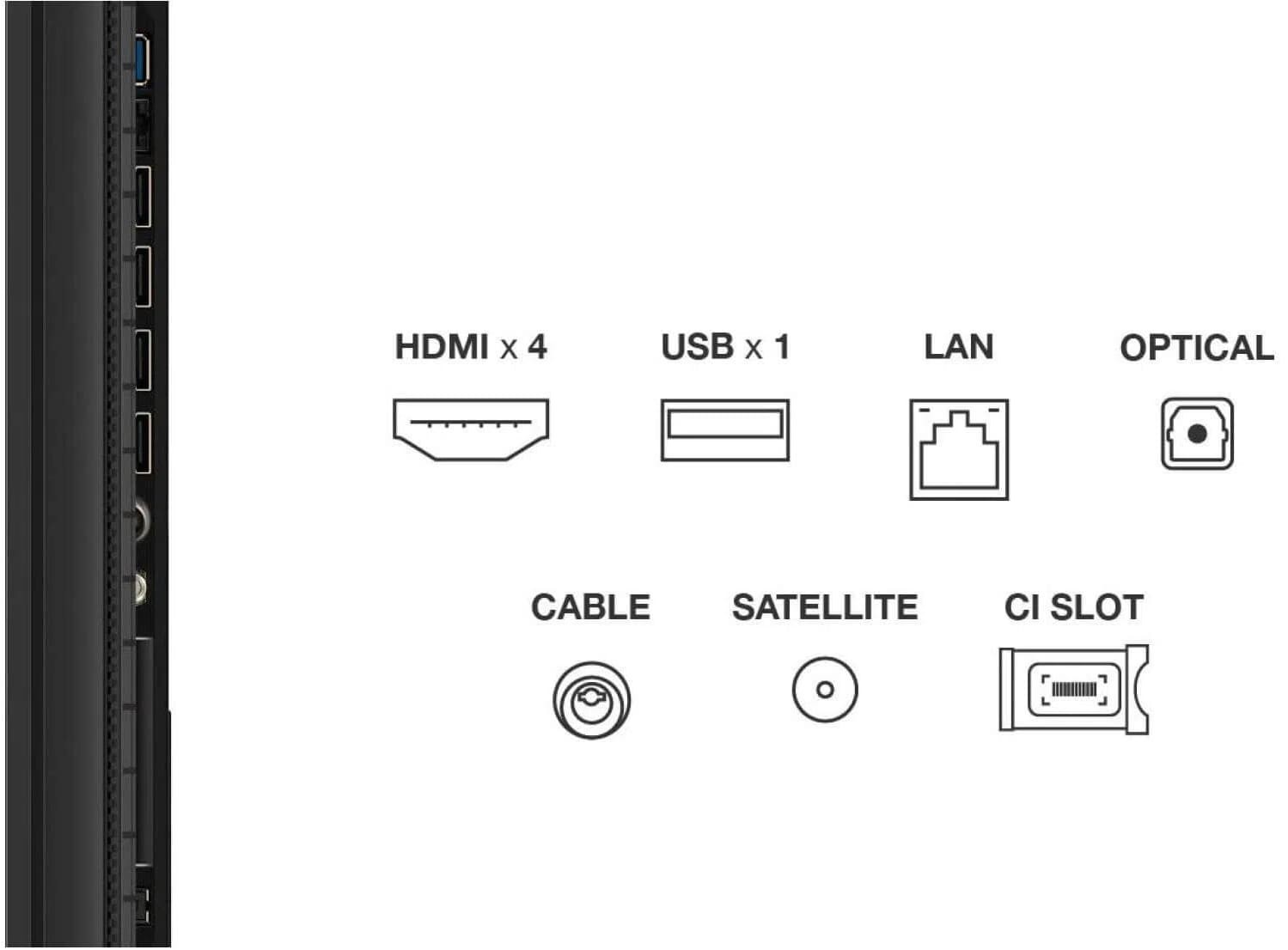 Телевізор оснащений чотирма роз'ємами HDMI 2.1, USB і LAN, що забезпечує зручність підключення різноманітної побутової техніки. Завдяки підтримці AirPlay 2 і Chromecast можна легко транслювати контент з мобільних пристроїв. Наявність Bluetooth v5.4, а також цифрових тюнерів DVB-T2, DVB-C і DVB-S2 робить телевізор універсальним медіацентром.