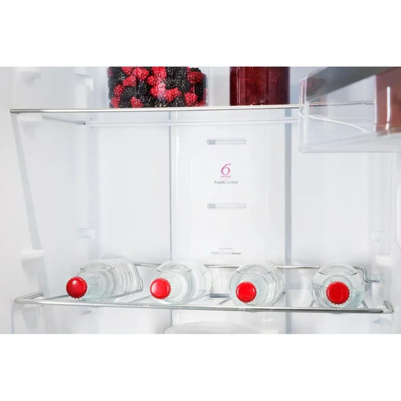 Корпус холодильника виготовлений з нержавіючої сталі Optic Inox, яка захищає від слідів пальців, гарантуючи легкість у догляді та блиск без забруднень. Таким чином, ваш холодильник завжди виглядатиме як новий. Однією з ключових технологій цієї моделі є 6-й З senses FreshControl, що автоматично регулює температуру і вологість всередині пристрою. Це забезпечує тривалу свіжість продуктів, що надзвичайно важливо для збереження їх якості та смакових властивостей.