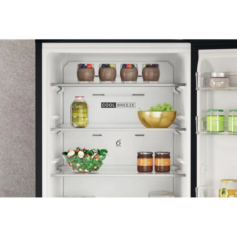 Внутрішній простір обладнано скляними полицями, які не тільки забезпечують надійність, але й надають елегантний вигляд. А завдяки сенсорам 6-го Знійсу, температура в холодильнику автоматично знижується після додавання нових продуктів, що дозволяє зменшити споживання енергії.