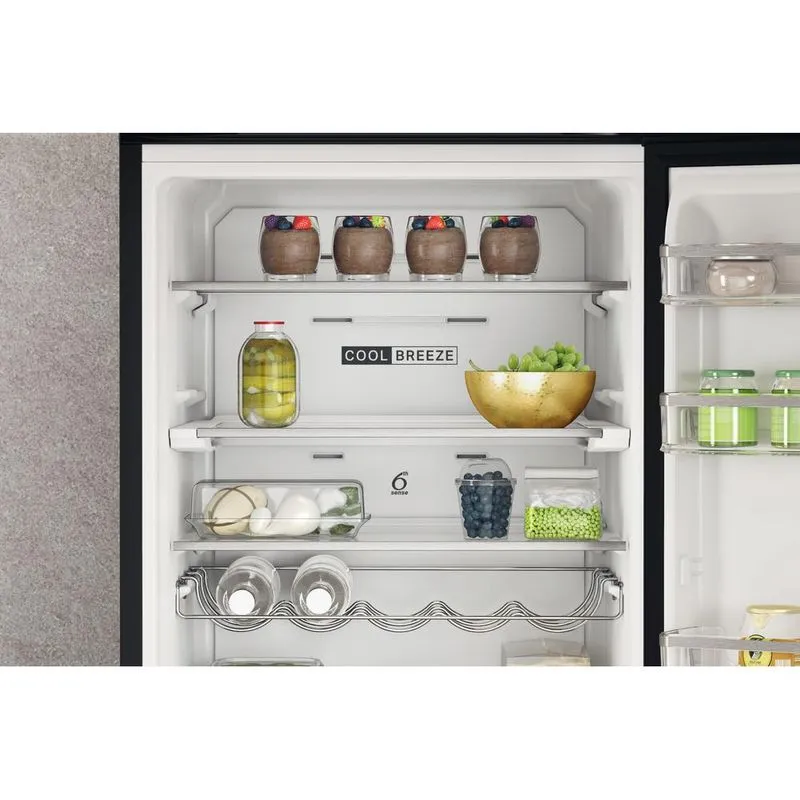 Високий дизайн холодильника дозволяє задовольнити потреби навіть великих сімей. Скляні полиці надають йому витривалості та вишуканості, а також створюють комфортний доступ до усіх продуктів. Крім того, даний холодильник обладнано інноваційними датчиками 6-го Займання, які автоматично знижують температуру в холодильній камері після додавання нових продуктів, що сприяє зниженню споживання електроенергії.